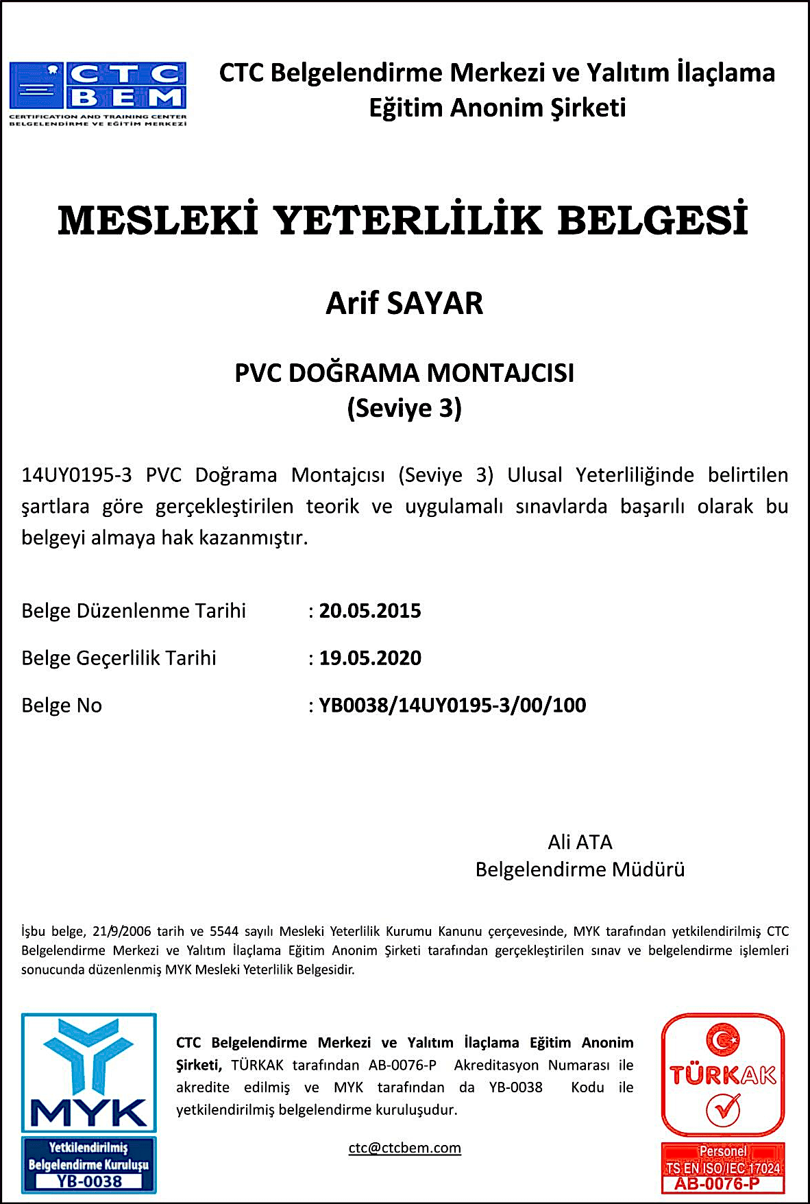 MYK Mesleki Yeterlilik Belgesine sahip olmak, meslekdaşları arasında bir adım önde olabilmek isteyen kişilerin taleplerini CTC BELGELENDİRME MERKEZİ A.Ş ve FIRAT PLASTİK Pinco nin aşağıdaki iletişim adreslerine iletmeleri gerekmektedir.