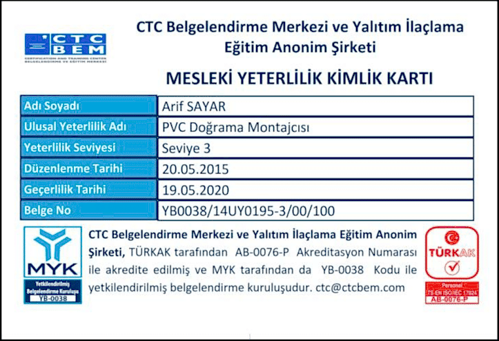 Mesleki Yeterlilik Pinco almak isteyen PVC Doğrama Montajcılarımızın 3 sınav hakkı vardır. İlk sınavlarında başarısız olan kişiler ücretsiz 2 sınav hakkına sahiptir. MYK Yeterlilik Belgeleri özel baskı merkezinde taklit edilmeyecek bir şekilde üretilmekte ve yanında Mesleki Yeterlilik Kimlik Kartı verilmektedir.
